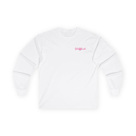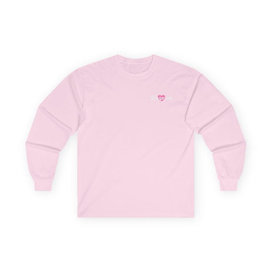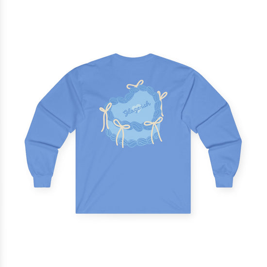 Soft, vintage-feel long sleeve tee with a playful, girly cake illustration in pastel pink. The image feels nostalgic — like a wrapped-up letter from afternoons spent at grandma’s kitchen table or a small celebration with close friends. Lightweight but substantial, the shirt holds its shape and shows off the delicate front chest script and larger back cake graphic without looking bulky. Wear it on slow Sundays, casual meetups, or low-key birthday hangs to bring a tender, handcrafted vibe to everyday outfits. The restrained palette and classic fit let the artwork be the focal point while the ribbed collar and shoulder tape keep the tee comfortable and reliably wearable.